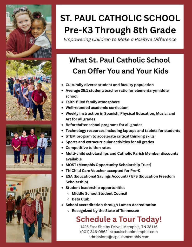 Applications are now available for the 2025-2026 school year for PreK 3 – 8th grade. Please contact the school office for more information 901.346.0862